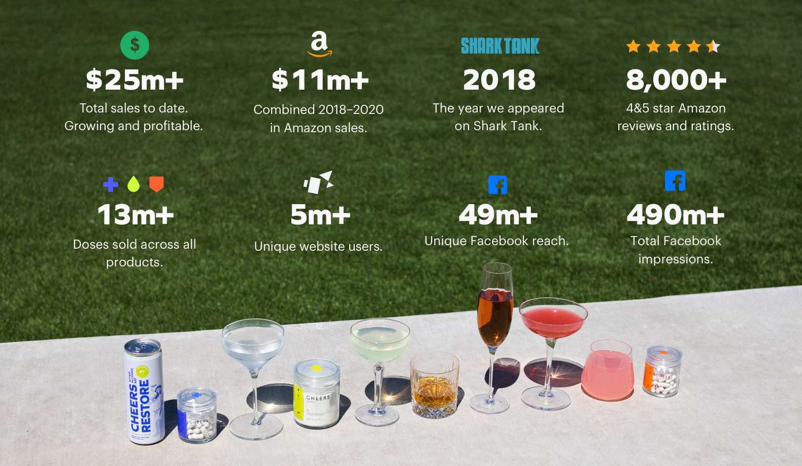 $25m & 13m+ doses sold to date: Since our appearance on Shark Tank in 2018, we have sold over $25m across the US solely through online channels, with most sales driven by our hero product, Cheers Restore. To date, weâve sold over 13m doses across all our products and have served 300k+ customers.